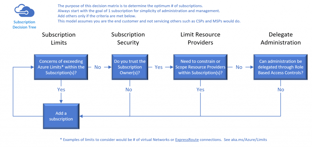 This old TechNet post was the culmination of several conversations about how many subscriptions is enough? While just one might be enough, hundreds isn’t manageable in most cases. So below are some decision criteria to consider, along with some summary thoughts at the bottom.